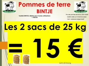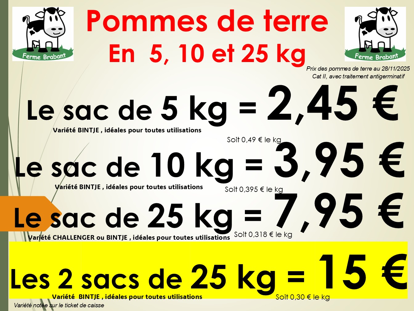 Voici le prix des pommes de terre affiché en date du 28/11/2025, en 5, 10 et 25kg